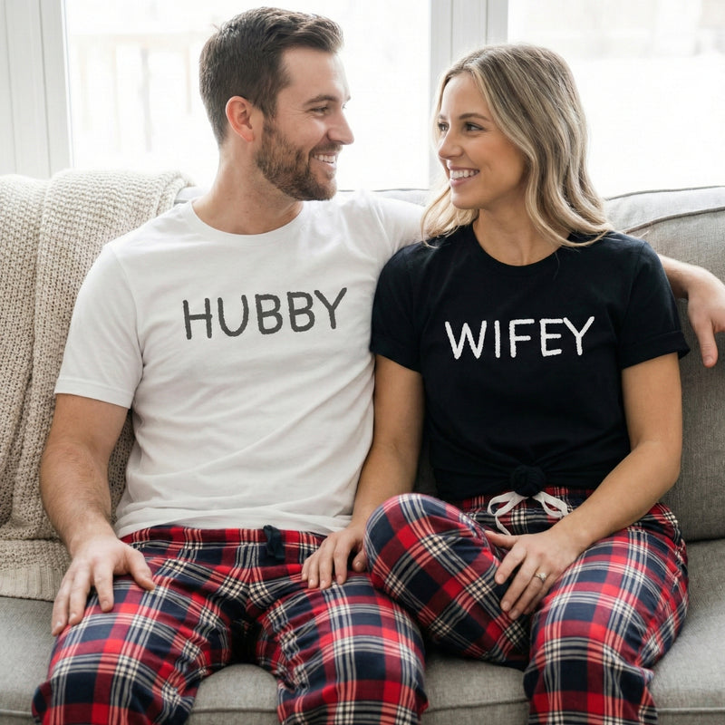 Hubby & Wifey - Couples Matching Pyjamas - Top & Tartan PJ Bottoms - (Sold Separately)