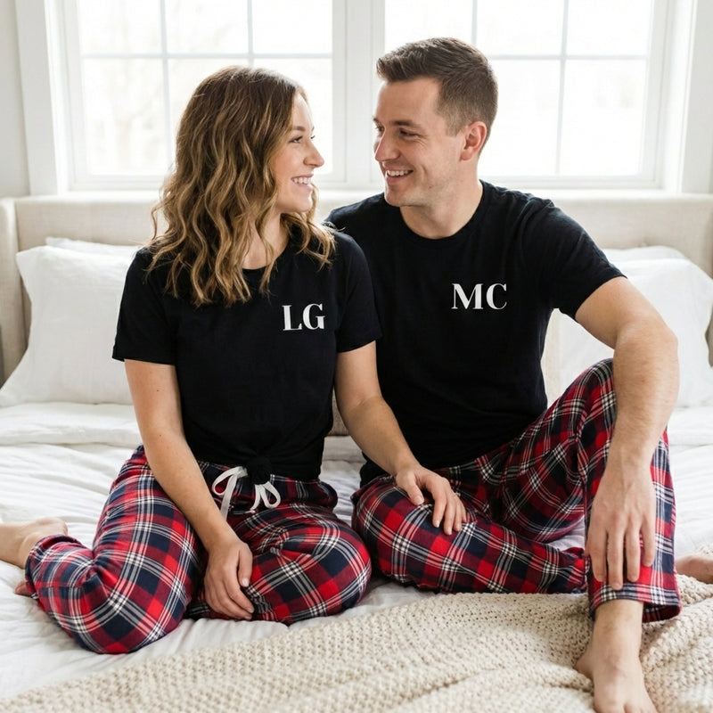 PERSONALISED Initials - Couples Matching Pyjamas - Top & Tartan PJ Bottoms - (Sold Separately)