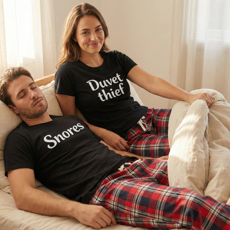Snoers & Duvet thief - Couples Matching Pyjamas - Top & Tartan PJ Bottoms - (Sold Separately)