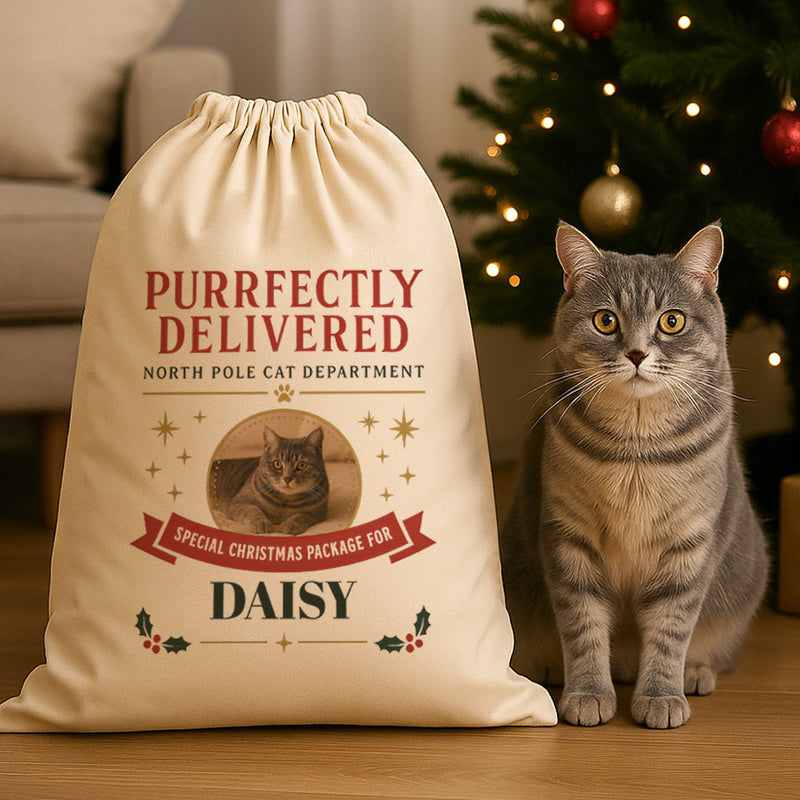 PERSONALISED Purrfectly Delivered North Pole - Christmas Cat Santa Sack
